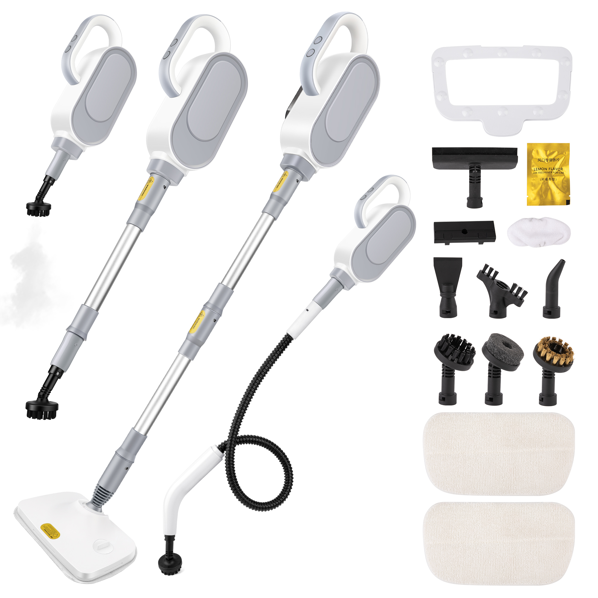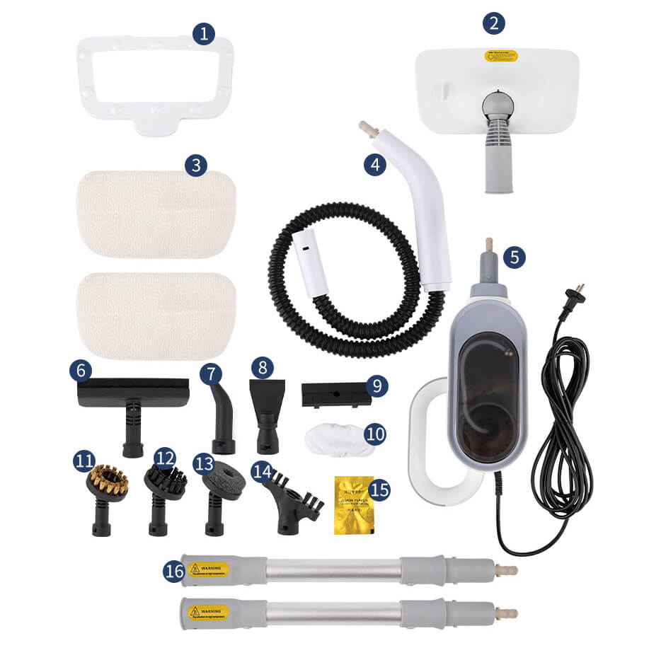 Steam mop connecting rods 2, Threaded tube 1,Crevice brush1 Round brush1, Carpet ral 1. Mop head 1 Scraper 1 Scrubberhead 1 Clas brush 1. roning board *1, Water tank *1, Angled nozzle *1, Copper brush head *1, Ironing board cloth 1,Mop cloth *2